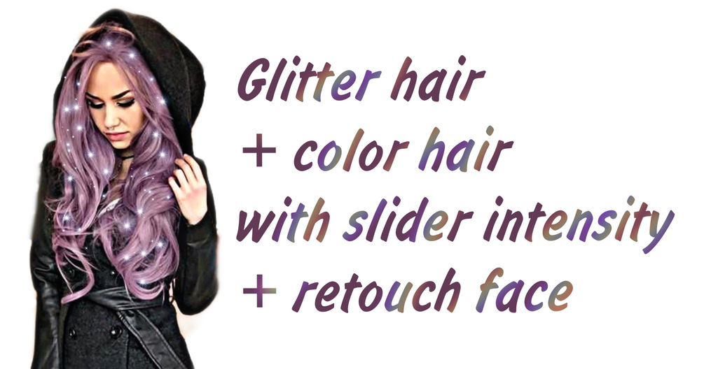 Shiny hair (with simple kira patch), colored hair, color easy to change and adjust with slider, face retouch